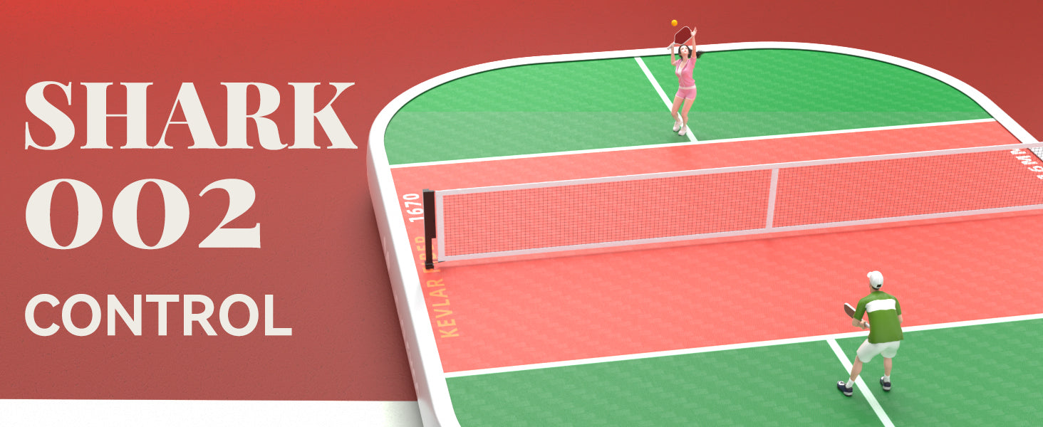 The SHARK 002 pickleball paddle combines Kevlar 1670 and T700 Carbon Fiber materials, providing outstanding spin for roll volleys and pinpoint control for finesse shots like dinking.